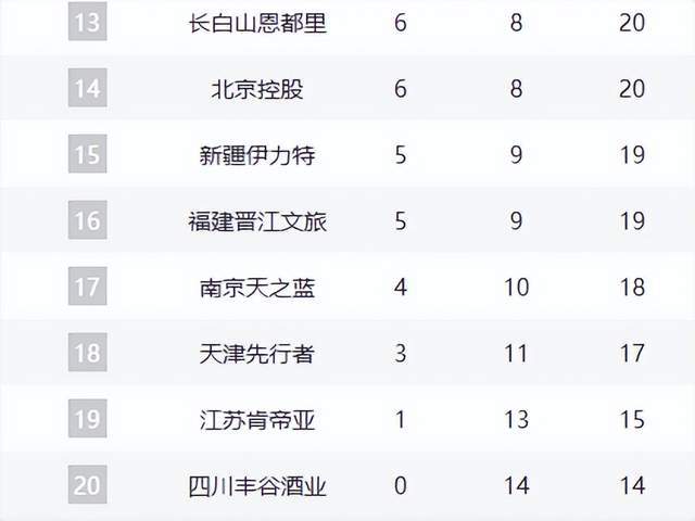 吉林、北控、新疆、福建和同曦位列13-17位。吉林队同样遭遇两连败,开局强势后战绩回落。北控队艰难战胜福建,止住颓势。新疆队换帅后攻守提升明显,惜败广厦展现潜力。同曦队阵容问题严重,晋级季后赛难度陡增。